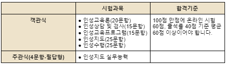 일정 - 65회 원서접수 : 2024년 2월 13일 ~ 2월 29일 시험 : 2024년 3월 23일(토) 11:00 - 66회 원서접수 : 2024년 5월 1일 ~ 5월 31일 시험 : 2024년 6월 22일(토) 11:00 - 67회 원서접수 : 2024년 8월 1일 ~ 8월 31일 시험 : 2024년 9월 21일(토) 11:00 - 68회 원서접수 : 2024년 11월 1일 ~ 11월 30일 시험 : 2024년 12월 14일(토) 11:00 시험은 온라인으로 시험 응시가 가능합니다.시험 과목 1. 인성 지도론 - 인성에 대한 학문적 이해, 인성지도의 방법과 창의성 개발, 학교와 가정 및 직장에서의 인성상담 등 인성지도 전반에 관한 사항 2. 인성교육학 - 인성교육의 이해와 인성 교육 프로그램 개발과 운용, 대상에 따른 인성교육과 방법 등에 관한 내용을 평가 3. 인성 상담학 - 인성상담이론 및 인성상담의 기법, 인성의 유형 및 인성검사 등 인성 상담에 관한 전반적인 내용을 평가 4. 윤리학 - 직업윤리와 자기이해, 인성수행을 위한 공동체의식 등 인성지도에 필요한 인성예절과 윤리에 관한 내용